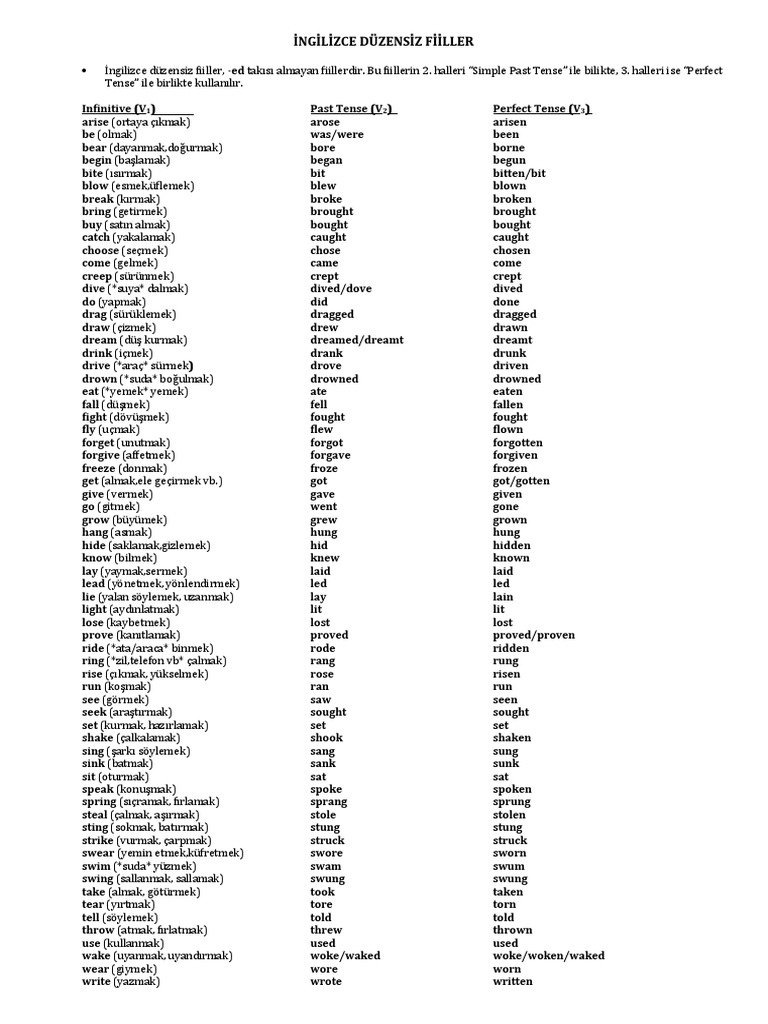 ingilizce fiil cekimleri tablosu ve turkce karsiliklari